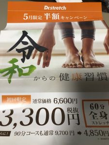 ドクターストレッチさん、ただいま令和キャンペーンというのをやっています。
